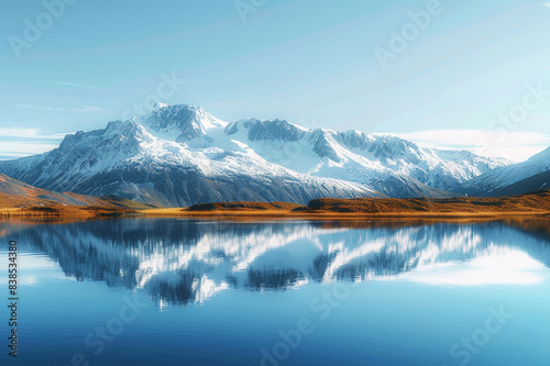 A crystal clear mountain lake with a reflection of the surrounding snow-capped peaks and blue sky. A fascinating lake and mountain view with mountains covered in snow.