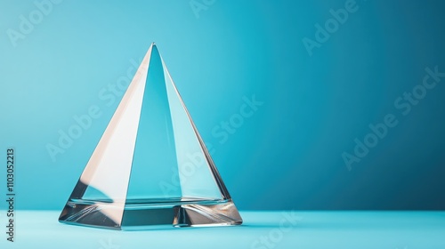 A crystal clear triangular trophy displayed on a serene blue background, highlighting vibrant light reflections and intricate angles.