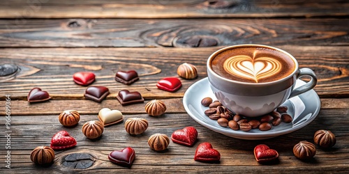 A cup of cappuccino with a heart design surrounded by heart-shaped chocolates on a wooden table