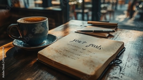 A cup of coffee and a journal with the words Your Goals written on the front page, set on a wooden table