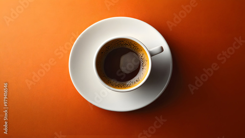 A cup of coffee centered in the image, viewed from the top, with a deep orange background.
