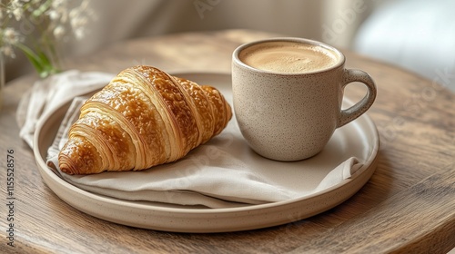 A cup of coffee in a mocha-toned mug sits beside a flaky croissant on a beige plate, complemented by a light brown linen napkin, creating a warm breakfast scene