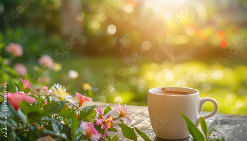 A cup of coffee is sitting on a table next to a bunch of flowers