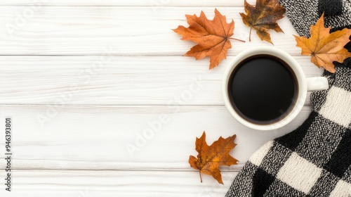 A cup of coffee rests on a white table, surrounded by vibrant autumn leaves and a soft, cozy blanket, creating a warm and inviting fall atmosphere