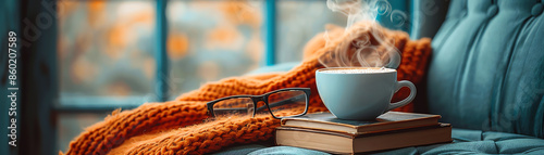 A cup of coffee sits on a stack of books, next to a pair of glasses. The background is a window with a view of autumn leaves.