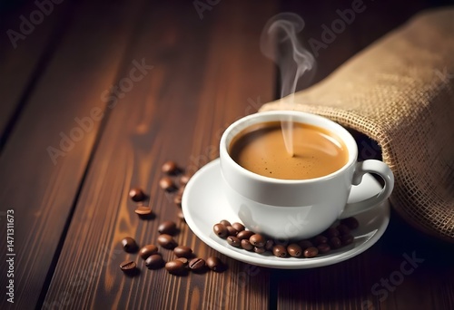 A cup of coffee with coffee beans on a wooden table, with a burlap sack in the background, steam rising from the cup .