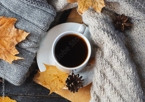 a Cup of hot coffee on the table with warm knitted autumn clothes top view
