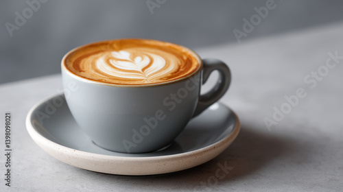 A cup of latte art coffee in a gray mug on a matching saucer with a neutral gray background