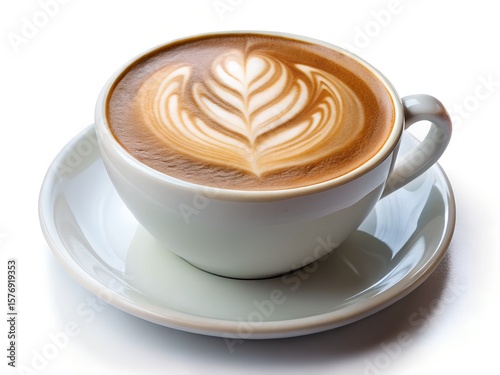 A cup of latte with beautiful latte art on a white saucer, isolated on white background