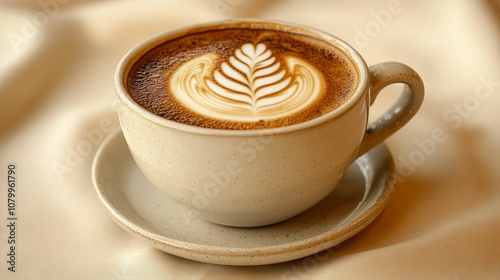 A Cup of Latte with Leaf Design in a Speckled Mug