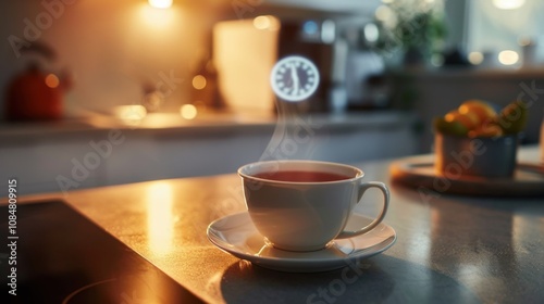A cup of tea with a digital clock floating above it, set on a modern kitchen counter, symbolizing the balance between traditional relaxation and modern time management