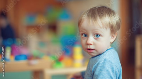 A curious baby boy in a nursery room with soft natural light and a blurred pastel background.