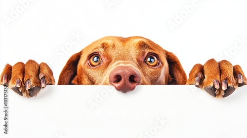 A curious dog peeks over a white surface, showcasing its expressive eyes and paws.