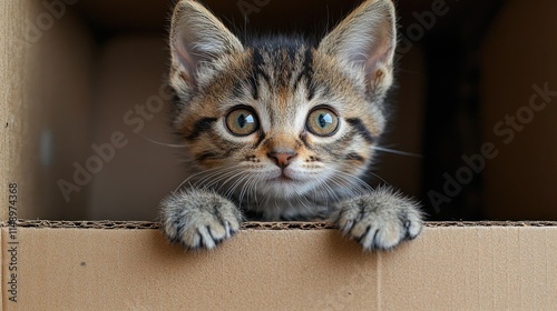 A curious kitten peeking out from a cardboard box, showcasing its playful nature.