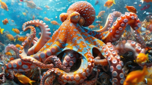 A curious octopus with vibrant tentacles observes colorful fish swimming in a lively underwater setting, showcasing a rich marine environment with coral and seaweed.