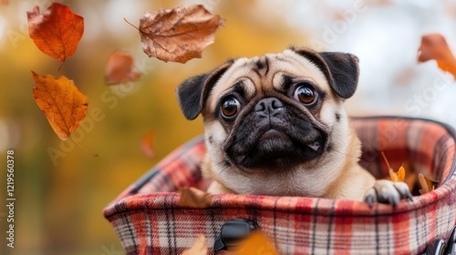 A curious pug surrounded by floating autumn leaves creates a picturesque moment of fall serenity, capturing the essence of the season and its fleeting beauty.
