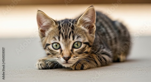 A curious tabby kitten with striking green eyes, low to the ground, gazes intently at the camera. Its short fur displays a classic tabby pattern
