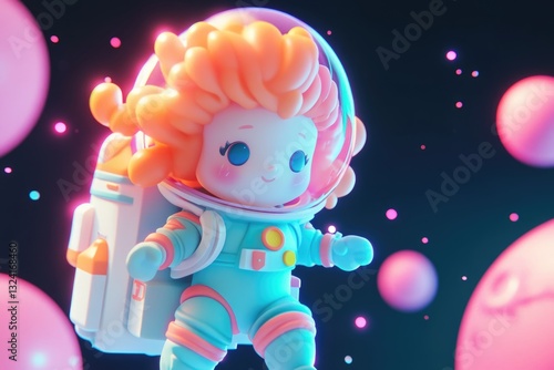 A cute astronaut girl with curly orange hair floats in space among colorful planets.