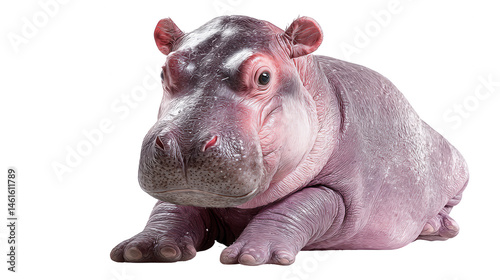 A cute baby hippopotamus is lying down on a white background looking at the camera with its big eyes.