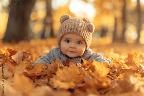 A cute baby playing in the pile of autumn leaves in the forest, with warm colors.