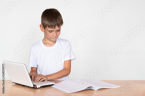 A cute boy sits at a table, prints on a laptop, looks into a notebook or book on a white background. Education concept
