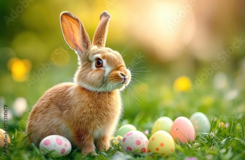 A cute brown rabbit sitting on green grass surrounded by colorful decorated Easter eggs in soft sunlight