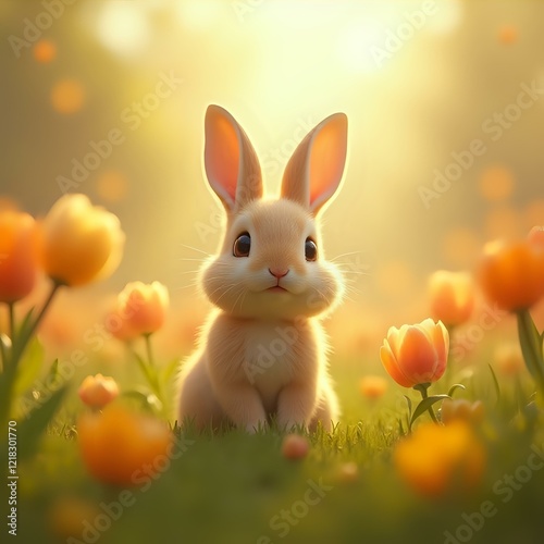 A cute cartoon rabbit sits in a field with sunbeams casting a warm glow on the surrounding flowers, creating a peaceful and idyllic scene.