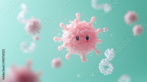 A cute, cartoonish representation of a virus in a playful, colorful environment.