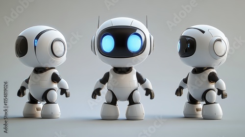 a cute, cartoonish robot character displayed in different poses. The robot stands upright, with a friendly expression, waving with one hand. Its large, expressive eyes are highlighted with a blue glow