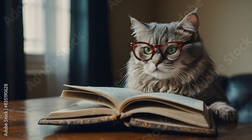 A cute cat wearing reading glasses and sitting on the sofa reading a book.