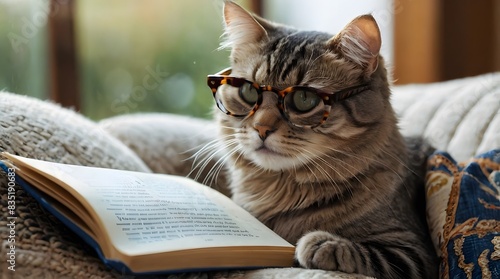 A cute cat wearing reading glasses and sitting on the sofa reading a book.