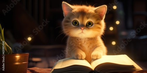 A cute cat with a book. Cute funny pet. The concept of home comfort, relaxation, reading, generative ai