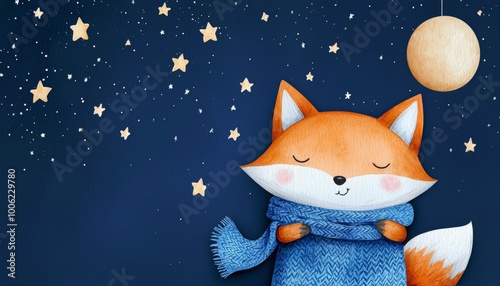 A cute, fluffy fox wrapped in a blue scarf, standing happily under a starry sky with a warm, glowing moon.