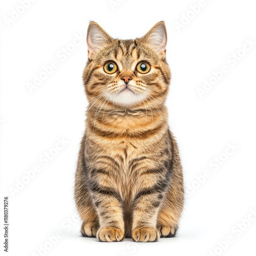 A cute, fluffy Scottish Fold cat with striking eyes, sitting upright against a white background, exuding charm and playfulness.
