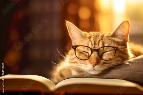 A cute ginger cat wearing eyeglasses, lying next to a book, portraying a smart and adorable feline engrossed in reading or perhaps taking a scholarly nap.