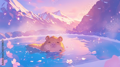 A cute hamster swimming in a tranquil lake surrounded by mountains at sunset.