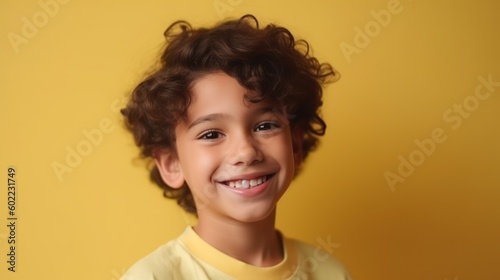 A cute little boy with a joyful smile, standing against a pastel-color background. Generative AI