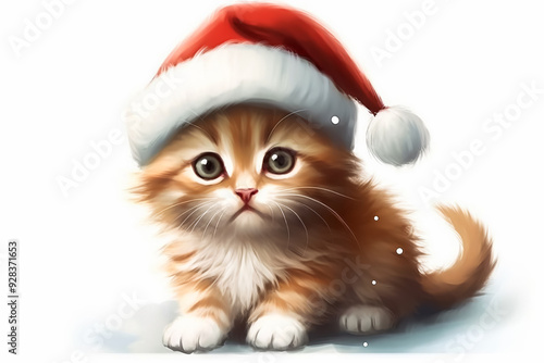 A cute orange and white cat wearing a red Santa hat. Perfect for adding a festive and charming touch to holiday-themed content.