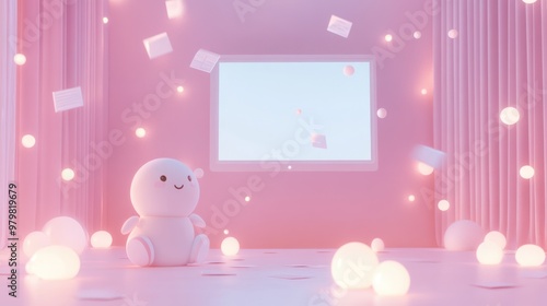 A cute, pastel-themed scene with a smiling toy and floating lights.