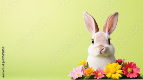 A cute rabbit surrounded by colorful flowers on a soft background.