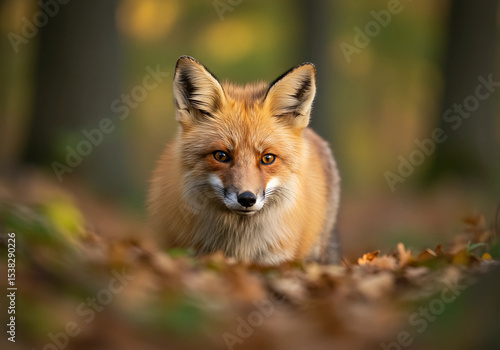 A cute red fox cub sitting in the woods, a young wild mammal and skillful predator