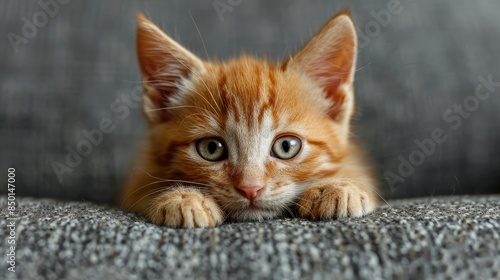 A Cute Red Kitten On A Grey Background, Creating A Funny And Endearing Photo