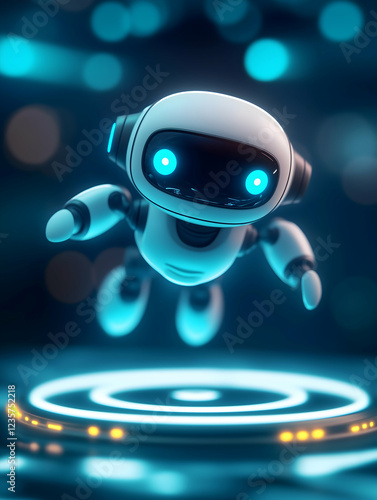 A cute robot with glowing blue eyes hovers above a circular platform, set against a vibrant, futuristic background.