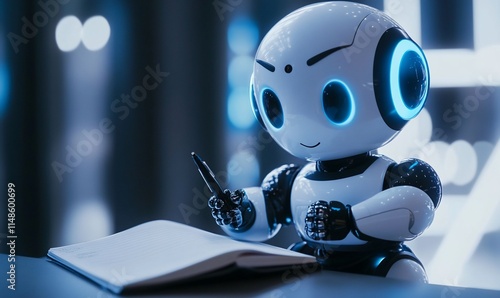 A cute robot writing in a notebook, symbolizing learning and creativity.