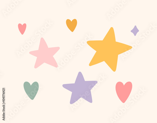A cute set of colorful stars and hearts. Vector hand-drawn illustration in flat style. Perfect for decorations, various designs..