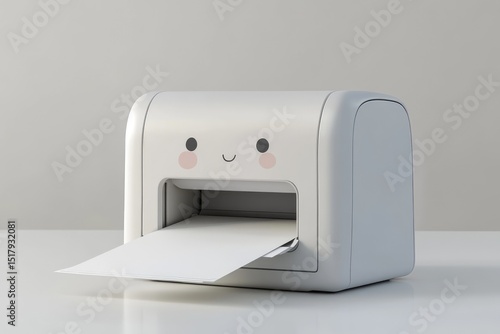 A cute, small, white printer with a simple smiling face design ejects a sheet of blank paper onto a white surface against a light grey background
