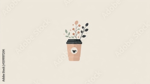 A cute, trendy minimalist logo of a coffee cup on the go in boho style. Flat illustration with neutral colors and a simple design on a clean white background, perfect for modern branding.