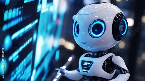A cute white robot stands next to a holographic display. Its blue eyes glow, showing off advanced AI concepts and futuristic technology.