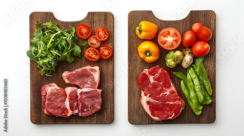 A cutting board with raw meat on one side and vegetables on the other, separated clearly