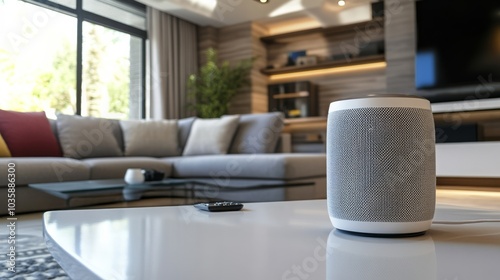 A cutting-edge home automation system, smart living room with voice-activated devices, Modern style